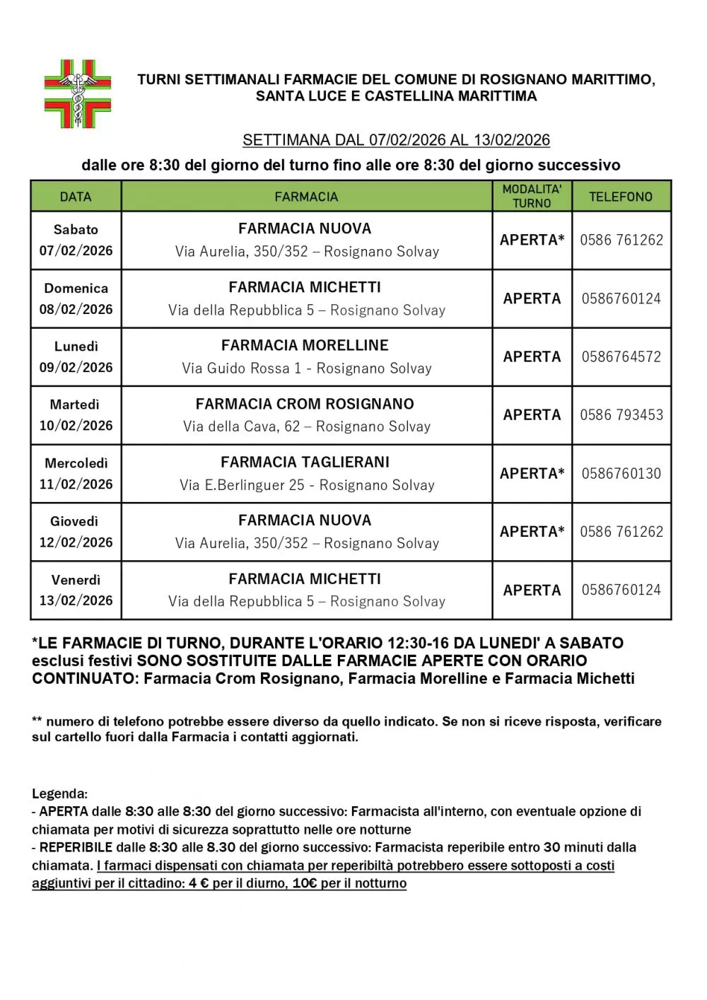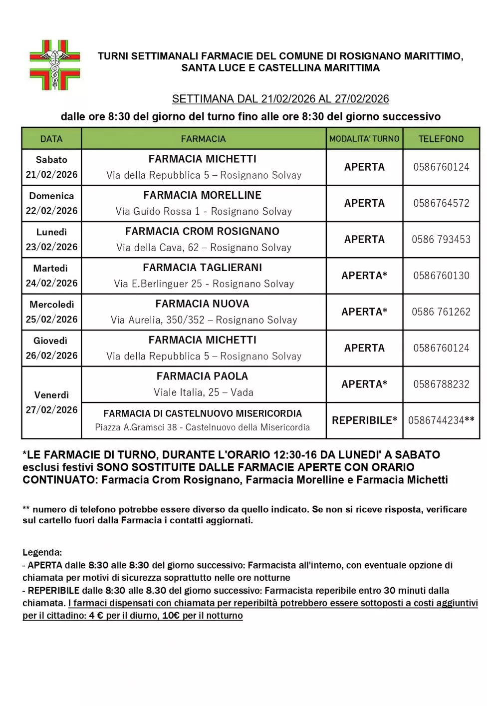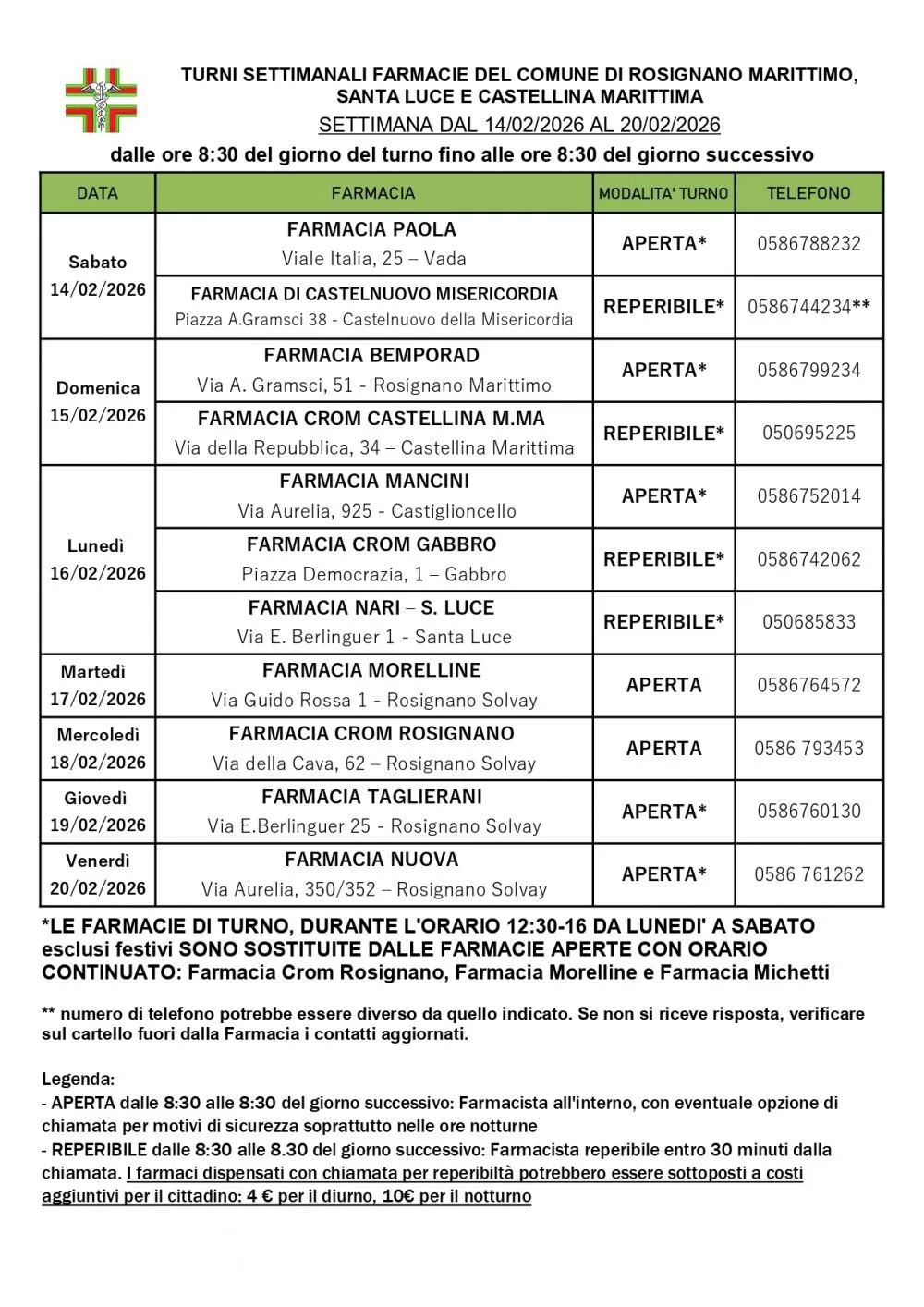 Solo la Farmacia C.RO.M. di Gabbro, RURALE e la “Farmacia di Castelnuovo della Misericordia” di Guidi Luigi & C. S.A.S. , RURALE, durante la SETTIMANA DEI RISPETTIVI TURNI, espletano il servizio a "battenti aperti" nei normali orari di apertura al pubblico e garantiscano la reperibilità agevole e tempestiva del farmacista, tramite chiamata, nelle ore in cui le Farmacie non sono aperte al pubblico, entro trenta minuti da quando è stata effettuata la medesima, con gli stessi obblighi, per il farmacista, di evasione delle ricette specificati nel precedente capoverso; Le Farmacie Urbane e Rurali, poste sul territorio del Comune di Rosignano Marittimo e sui territori dei Comuni limitrofi di Castellina M.ma e di Santa Luce, durante la SETTIMANA DEL TURNO, come da tabella sotto riportata, entrino in turno dalle ore 08,30 del sabato fino alle 8:30 del sabato successivo. E’ prevista la chiusura della farmacia nell’orario della pausa pranzo nella giornata di turno, con esclusione della domenica e delle festività nazionale, in considerazione dell’orario infrasettimanale continuato espletato dalla farmacia Michetti fino alle 19:30 e, anche di sabato, dalla Farmacia CROM di Rosignano Solvay fino alle ore 20,00 e dalla Farmacia Morelline fino alle 17:00