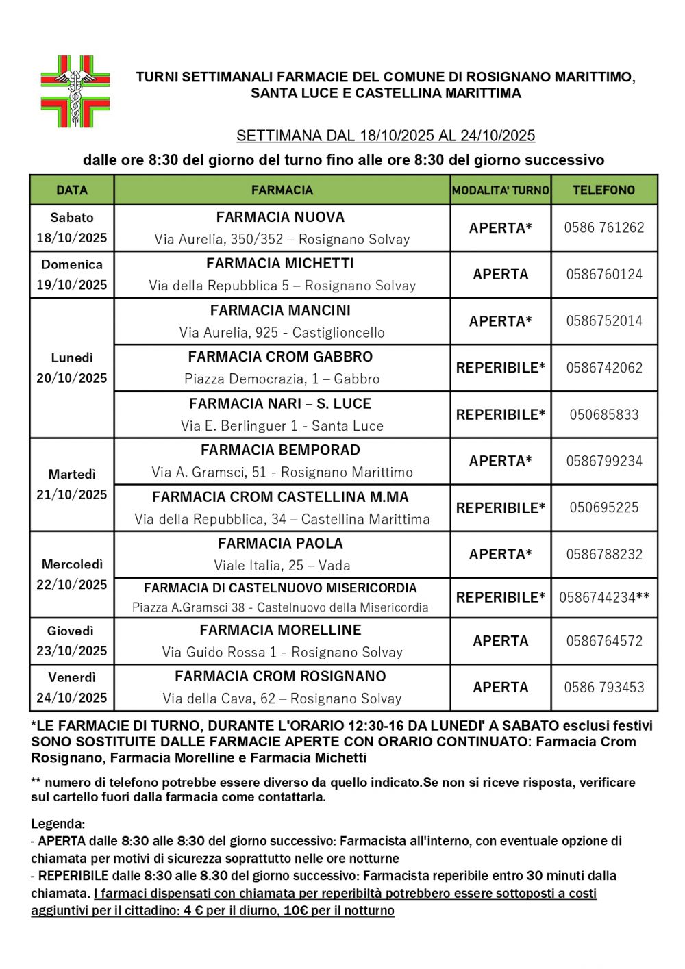 Turni Rosignano Marittimo - 18/10/2025 al 24/10/2025