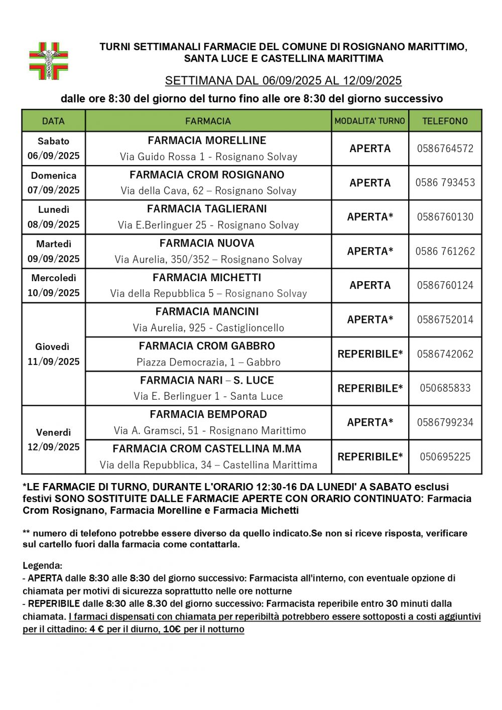 Turni Rosignano Marittimo - dal 06/09/2025 al 12/09/2025