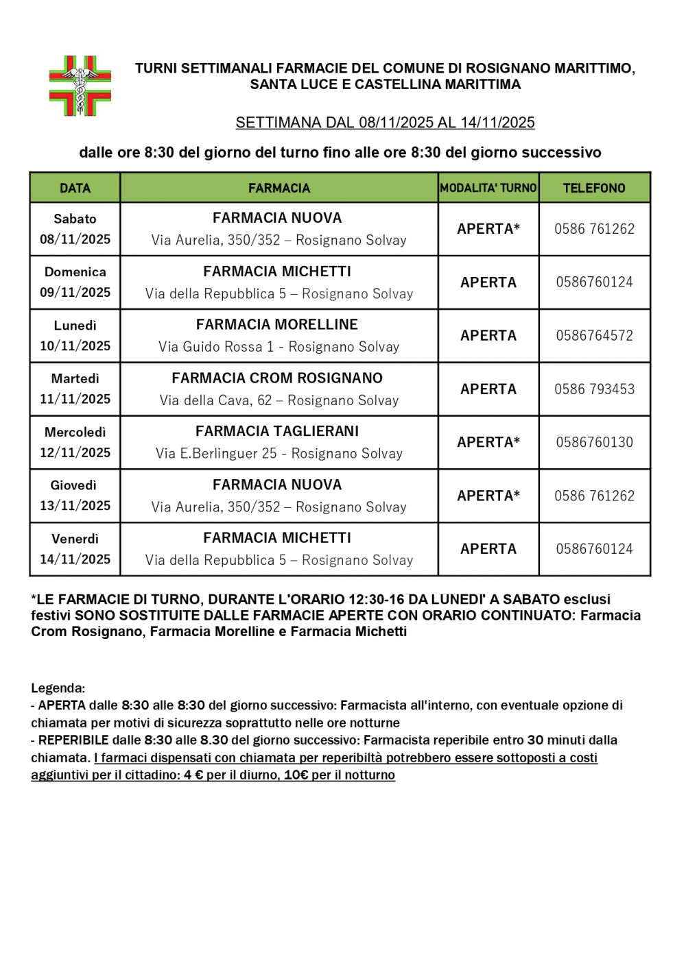 Turni Rosignano Marittimo - dal 08/11/2025 al 14/11/2025