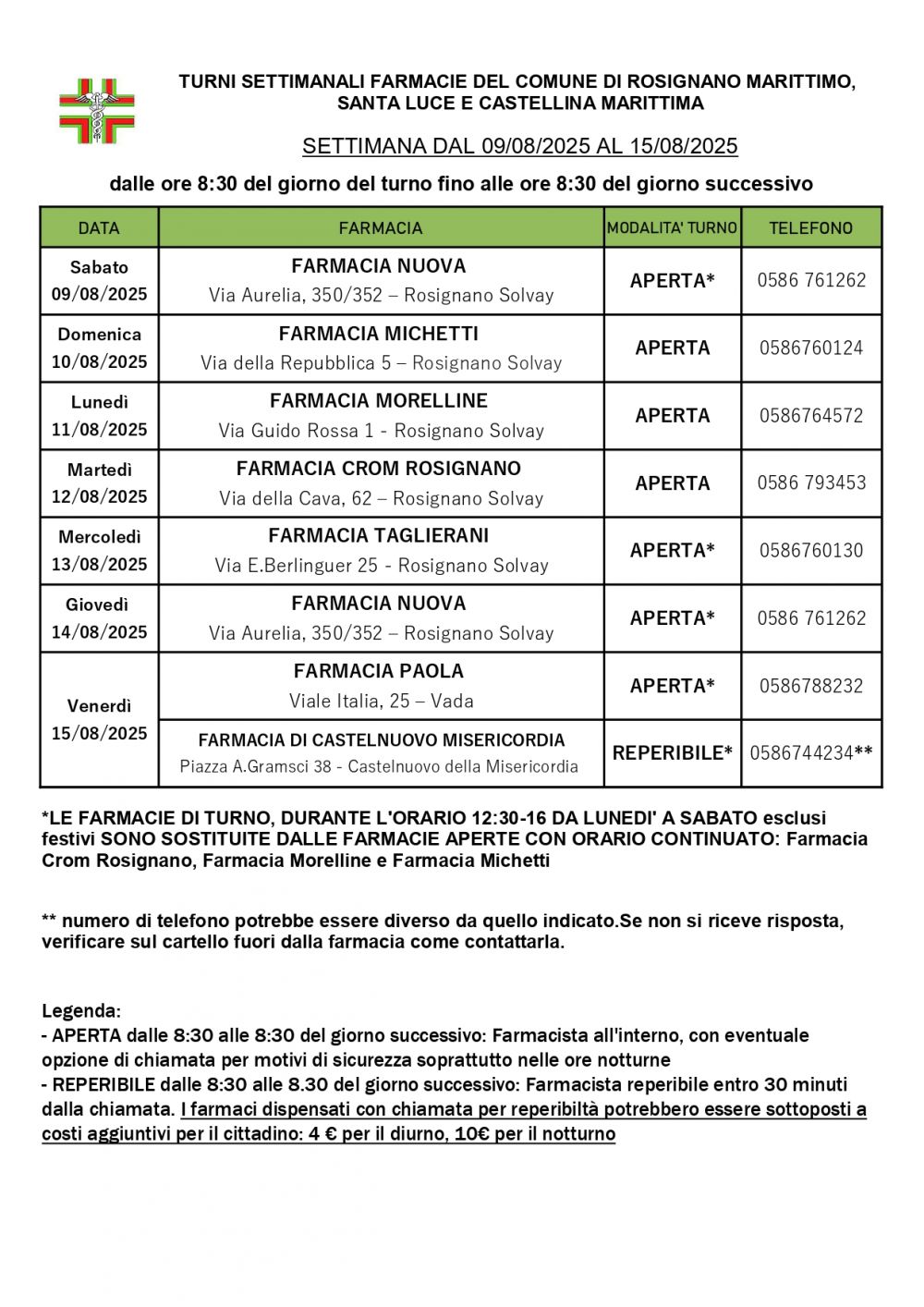 Turni Rosignano Marittimo - dal 09/08/2025 al 15/08/2025