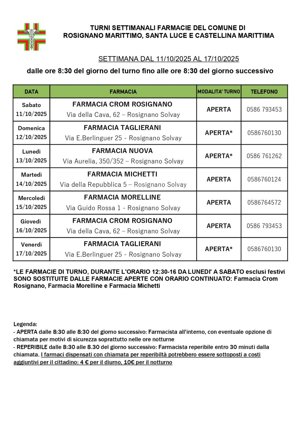 Turni Rosignano Marittimo - dal 11/10/2025 al 17/10/2025