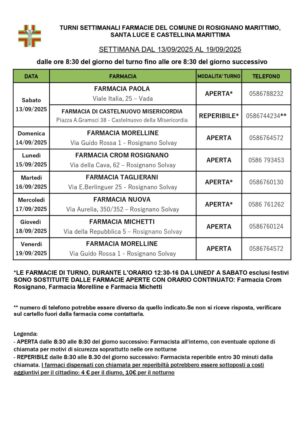 Turni Rosignano Marittimo - dal 13/09/2025 al 19/09/2025