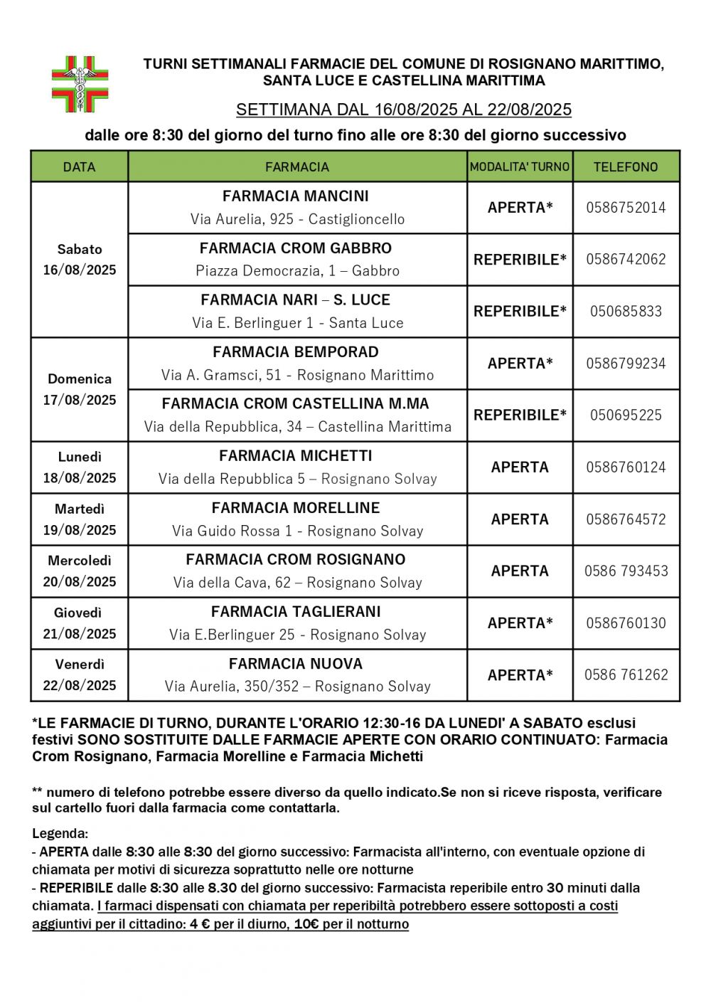 Turni Rosignano Marittimo - dal 16/08/2025 al 22/08/2025