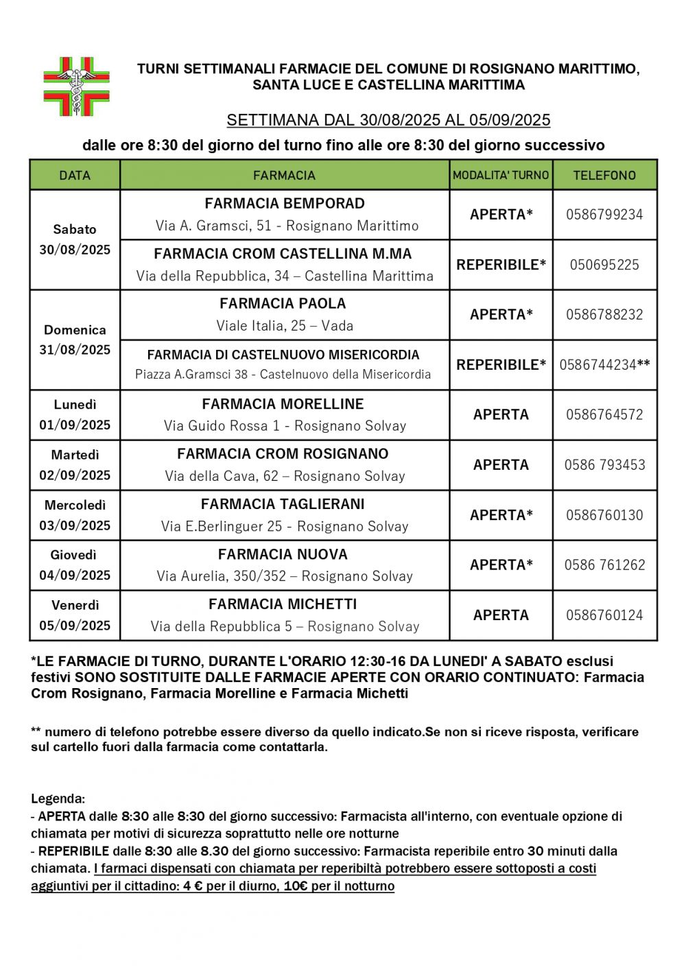 Turni Rosignano Marittimo - dal 30/08/2025 al 05/09/2025