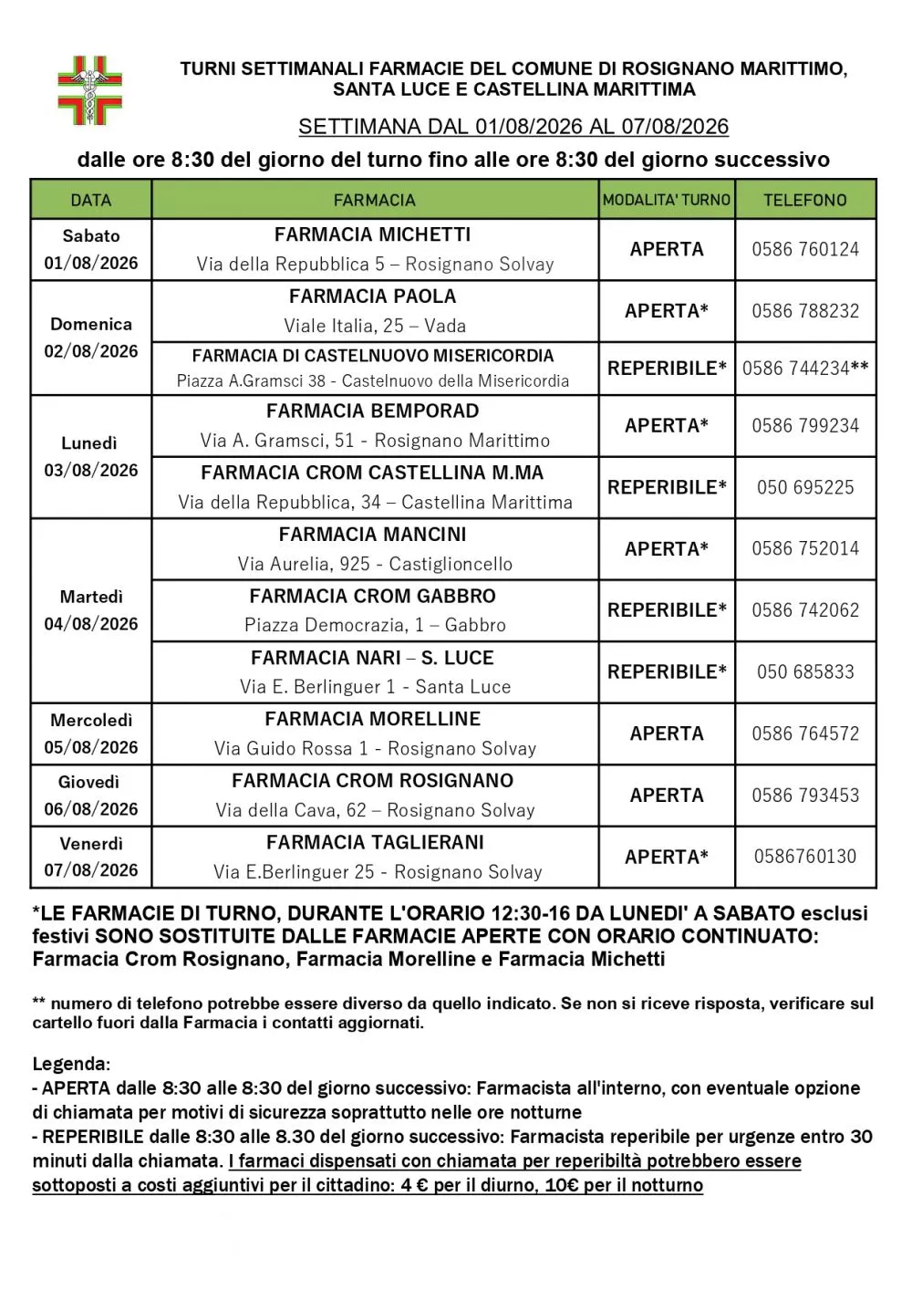 Turno Rosignano dal 01/08/2026 al 07/08/2026