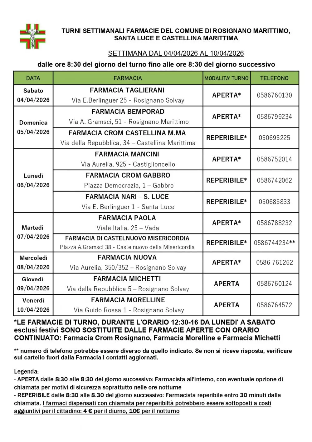 Turno Rosignano dal 04/04/2026 al 10/04/2026
