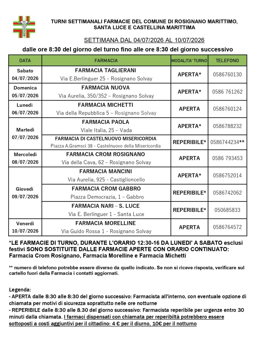 Turno Rosignano dal 04/07/2026 al 10/07/2026