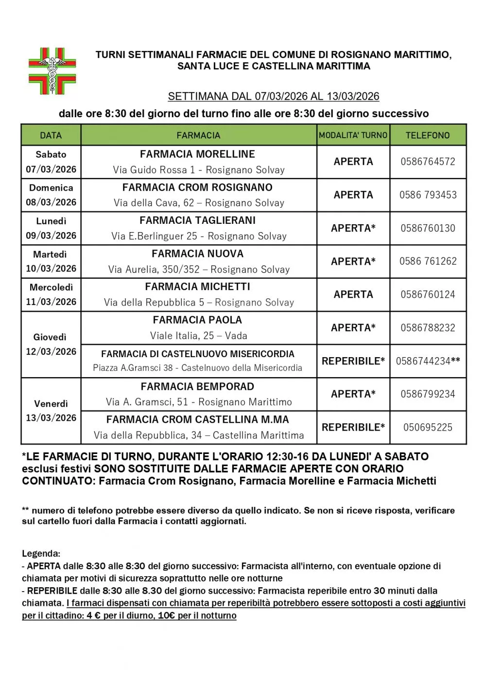 Turno Rosignano dal 07/03/2026 al 13/03/2026
