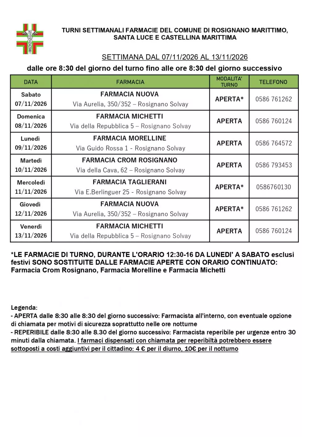Turno Rosignano dal 07/11/2026 al 13/11/2026