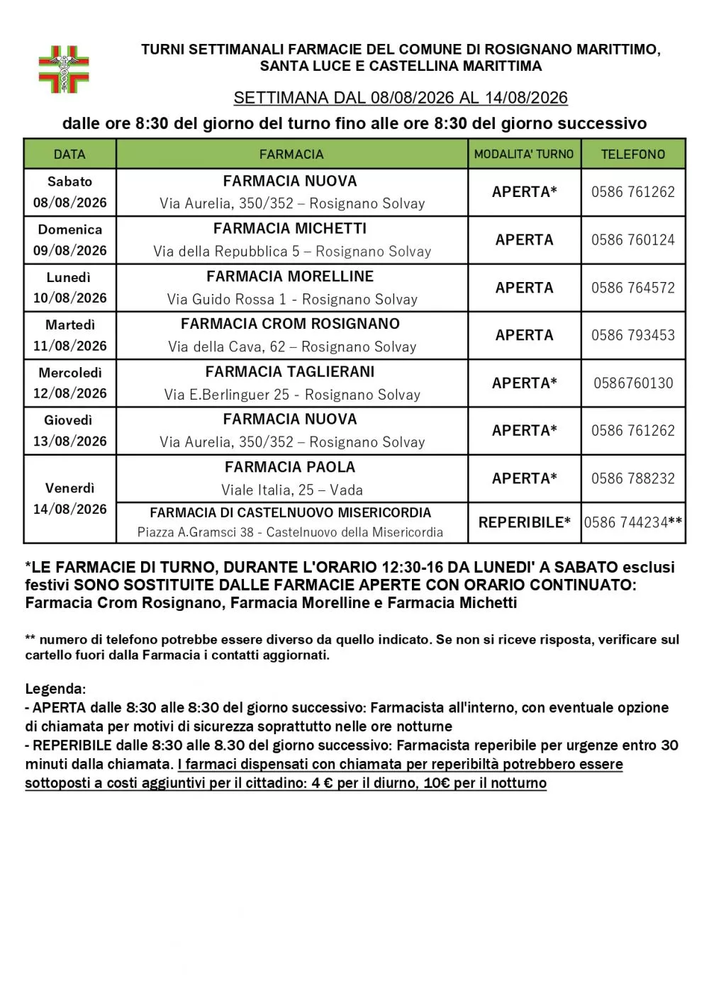 Turno Rosignano dal 08/08/2026 al 14/08/2026