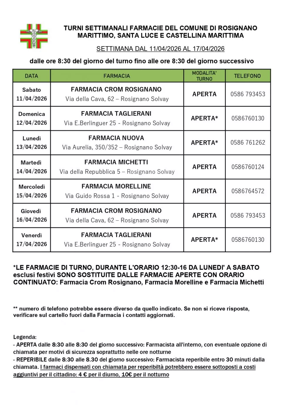 Turno Rosignano dal 11/04/2026 al 17/04/2026