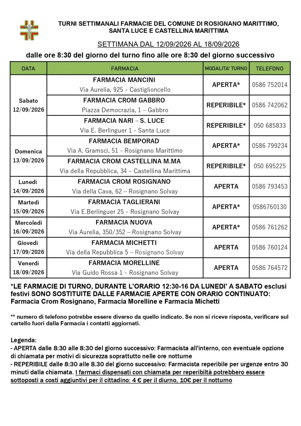 Turno Rosignano dal 12/09/2026 al 18/09/2026