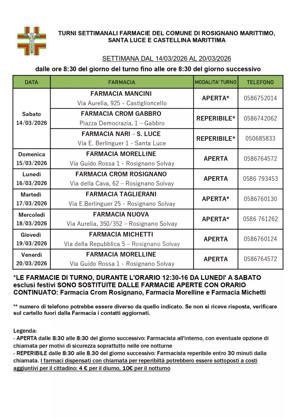 Turno Rosignano dal 14/03/2026 al 20/03/2026