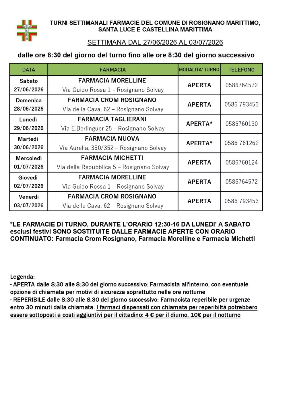 Turno Rosignano dal 27/06/2026 al 03/07/2026