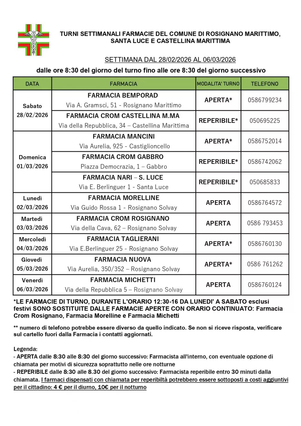 Turno Rosignano dal 28/02/2026 al 06/03/2026