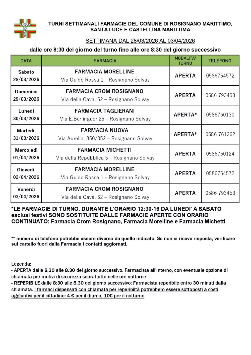 Turno Rosignano dal 28/03/2026 al 03/04/2026
