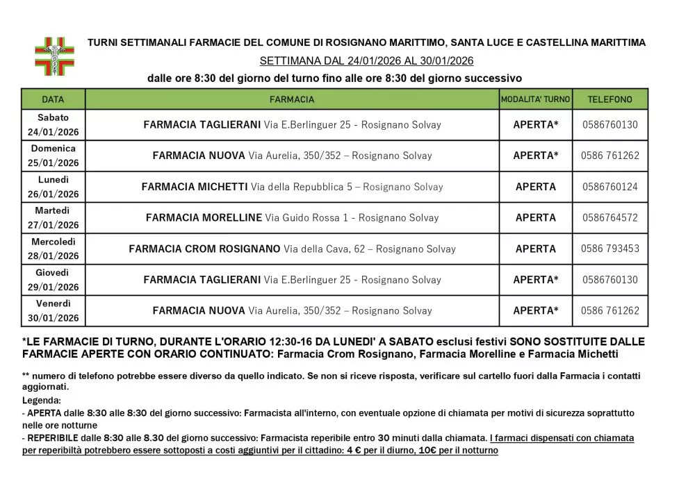 Turno Rosignano Marittimo dal 24/01/2026 al 30/01/2026